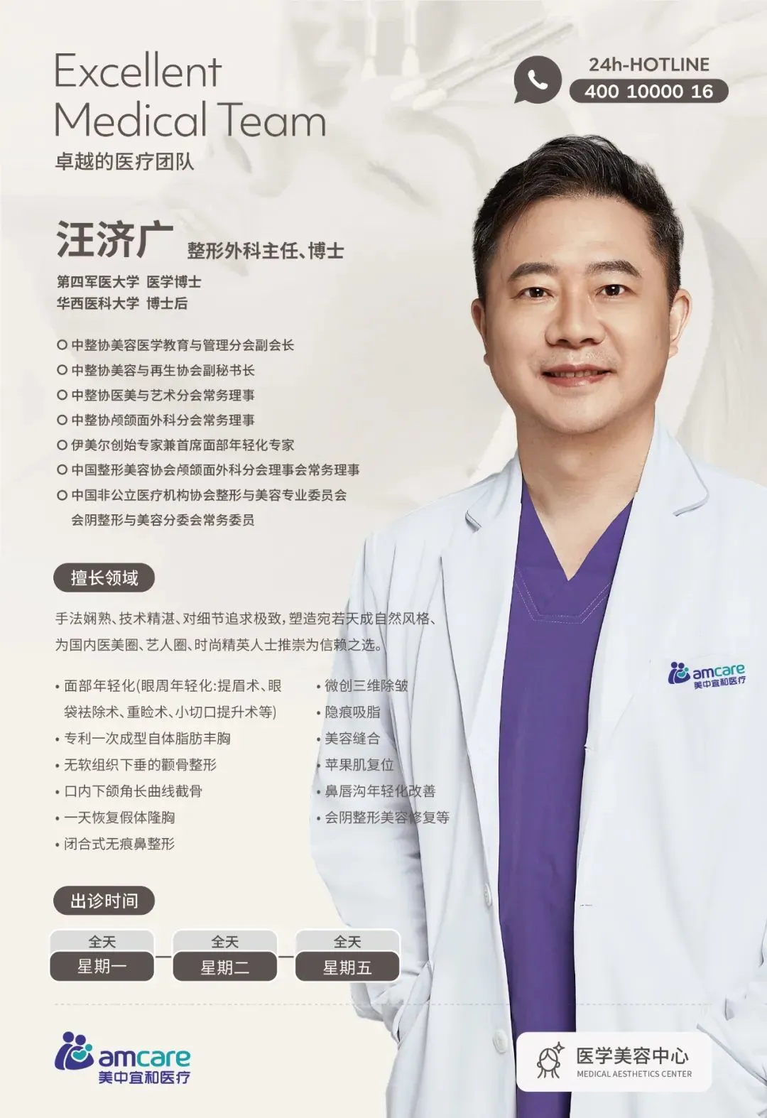 美中(zhong)宜咊(he)醫(yī)美中(zhong)心專(zhuan)傢(jia)團(tuán)隊(duì)又(yòu)添新(xin)力(li)量特邀專(zhuan)傢(jia)——整形外科(ke)汪濟廣(guang)主(zhu)任2025年(nian)7月起開始在(zai)北京宜咊(he)醫(yī)院出診啦! 醫(yī)生(sheng)簡介 汪濟廣(guang)主(zhu)任在(zai)第四軍醫(yī)大(da)學(xué)獲得博士學(xué)位,并于(yu)